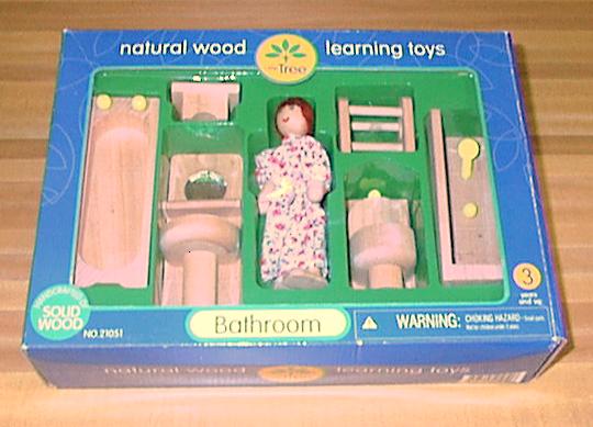 The Little Tree natural wood dollhouse bathroom furniture sets contain a tub, sink with mirror, toilet, shower, bench, towel rack and a wooden doll. The doll has hair made of yarn and bendable wire legs and arms. The fixtures on the bathroom furniture are painted yellow. The packaging for the set reads "Little Tree," "Distributed by Target Corporation," and "MADE IN CHINA."