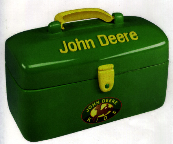 The children's toolbox is a soft-shelled, plastic, green box with a yellow handle and yellow raised letters that read "John Deere." A John Deere Kids logo with a fawn inside a red oval is imprinted on the front of the toolbox. The toolbox is sold with a green and yellow plastic ratchet wrench and pliers inside. Stamped on the bottom of the product is "JOHN DEERE LICENSED PRODUCT" and "MADE IN CHINA." All yellow-handled toolboxes are included in this recall.